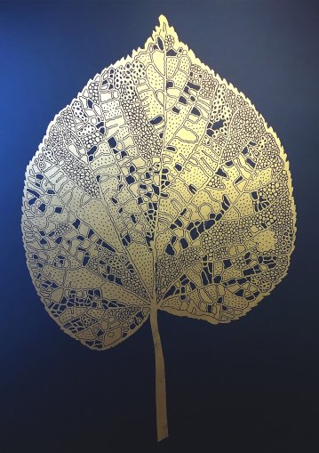 A design is cut into the linoleum surface with a sharp knife, V-shaped chisel or gouge, with the raised (uncarved) areas representing a reversal (mirror image) of the parts to show printed. The linoleum sheet is inked with a roller, and then impressed onto paper or fabric.