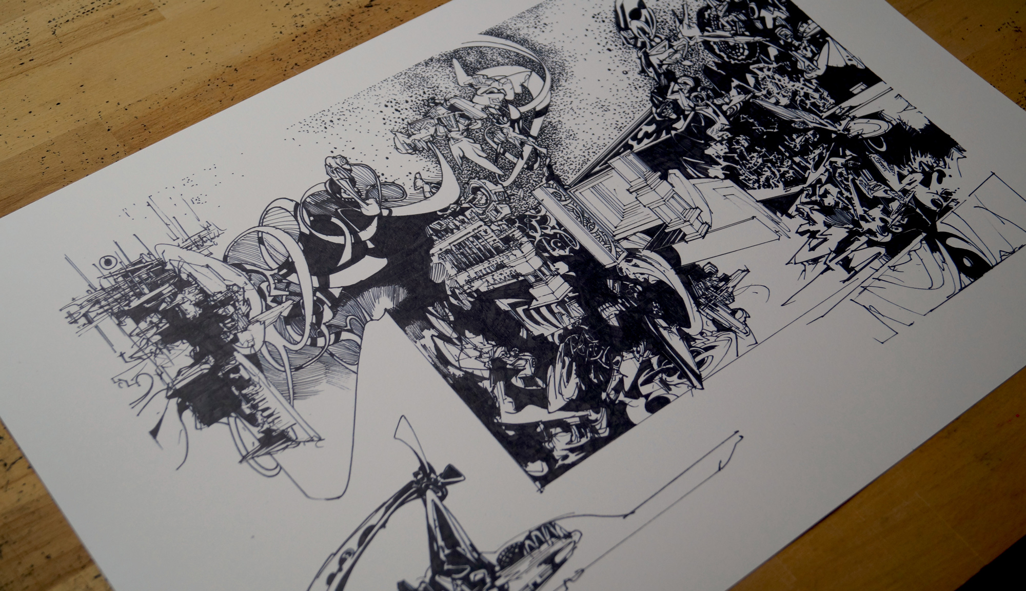 The drawings are the subject of Juliussens rich imagination and they often have wild sweeping lines, undulating curves, spiraling forms, along with surreal vivid three dimensional architectural constructions.