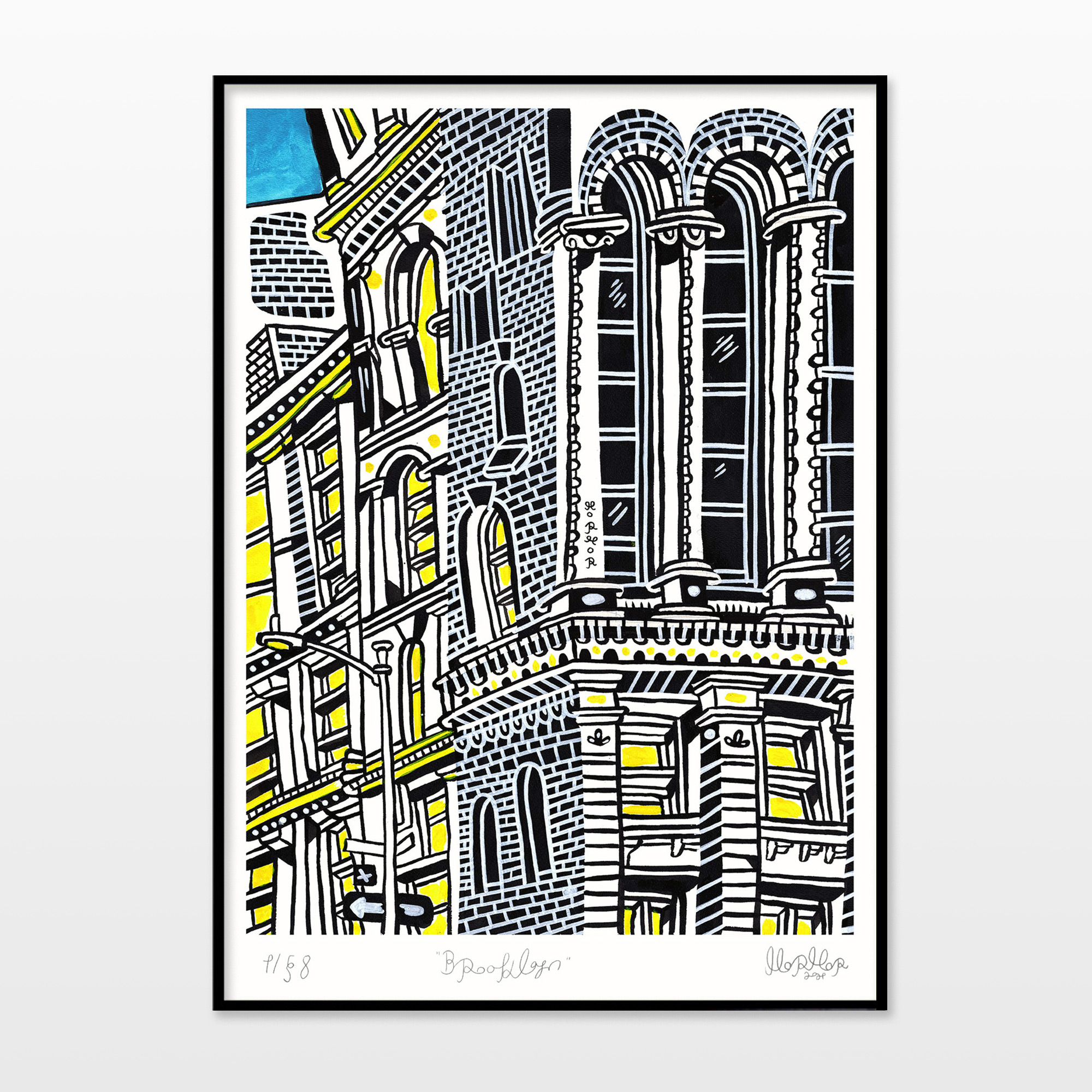 The style of drawing is young, fresh and easy to recognize as an illustration by the hand of Mormor with its very personal expression: Buildings, cities, figures and several other images appear with the well-known line in various medias. With a playfull approach he keeps on challenging his media, exploring several techniques of painting and printing and never ending the process of constantly renewing himself as an artist.
