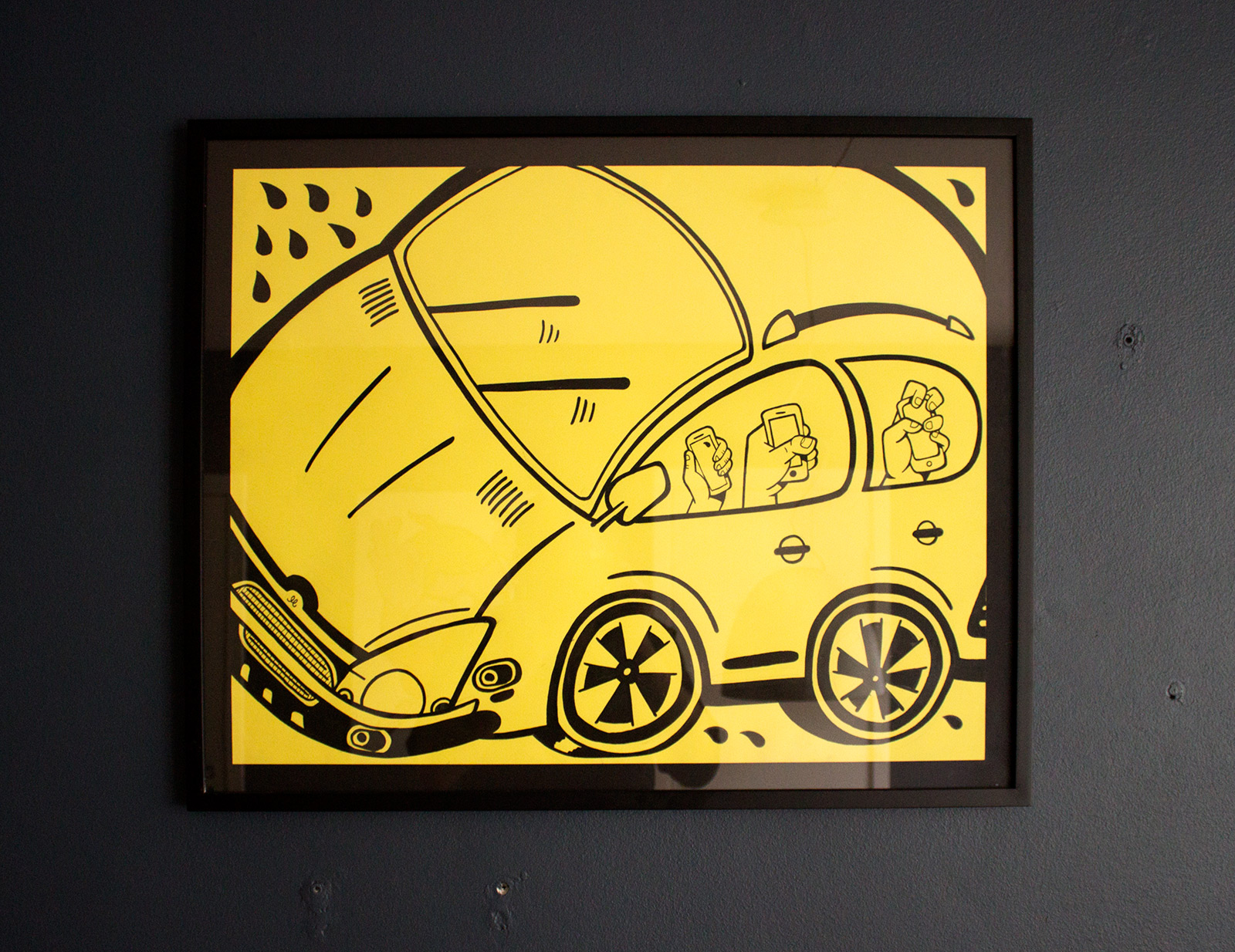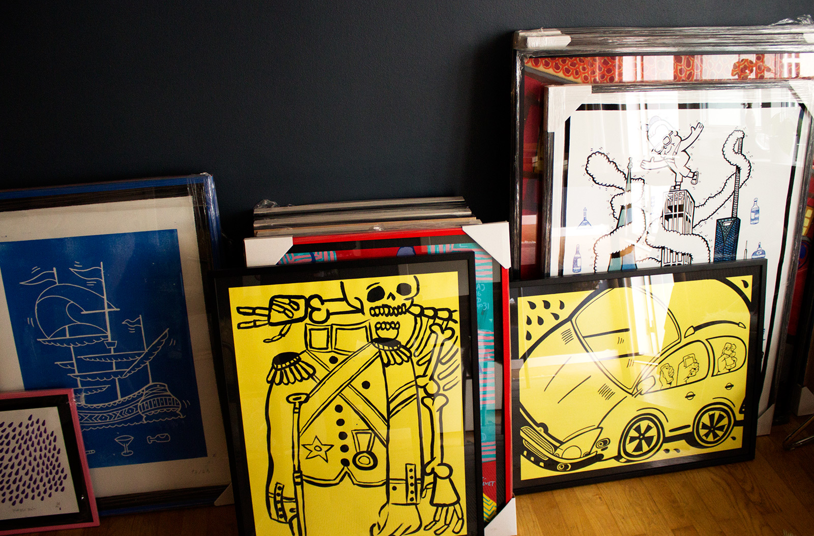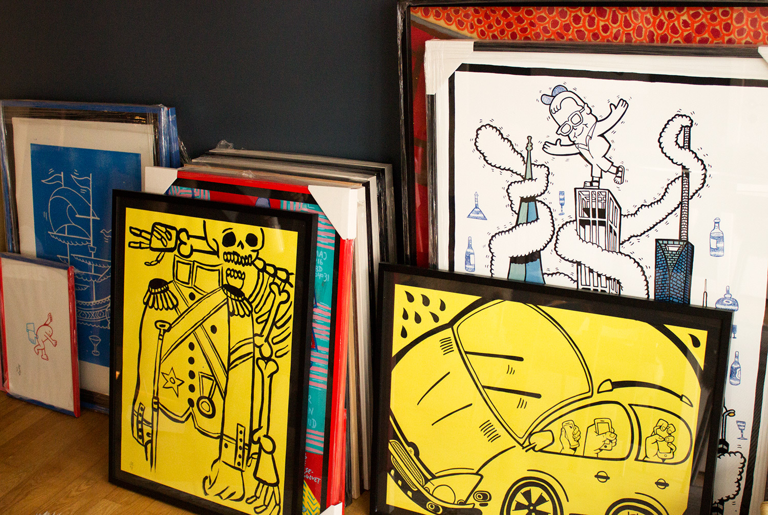 The style of drawing is young, fresh and easy to recognize as an illustration by the hand of Mormor with its very personal expression: Buildings, cities, figures and several other images appear with the well-known line in various medias. With a playfull approach he keeps on challenging his media, exploring several techniques of painting and printing and never ending the process of constantly renewing himself as an artist.